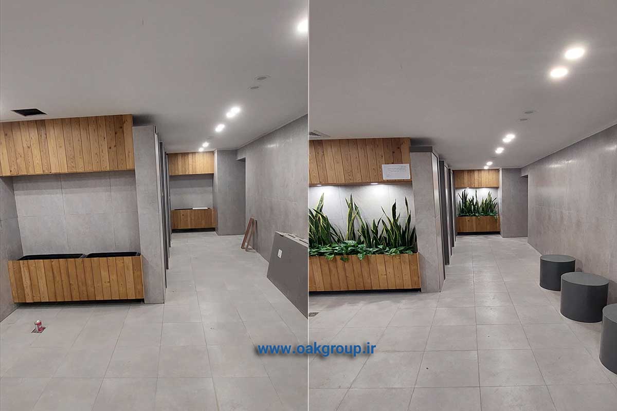 در انتها کلیه اقدامات دکوراتیو همچون فلاورباکس با گل طبیعی و بدنه ترموود و نصب شیرآلات و اکسسوری ها انجام گرفته است.